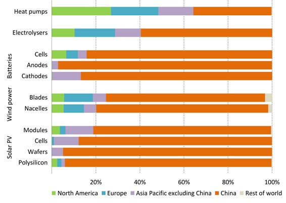 Regioners kapacitet att tillverka vissa energirelaterade komponenter. Källa: IEA.